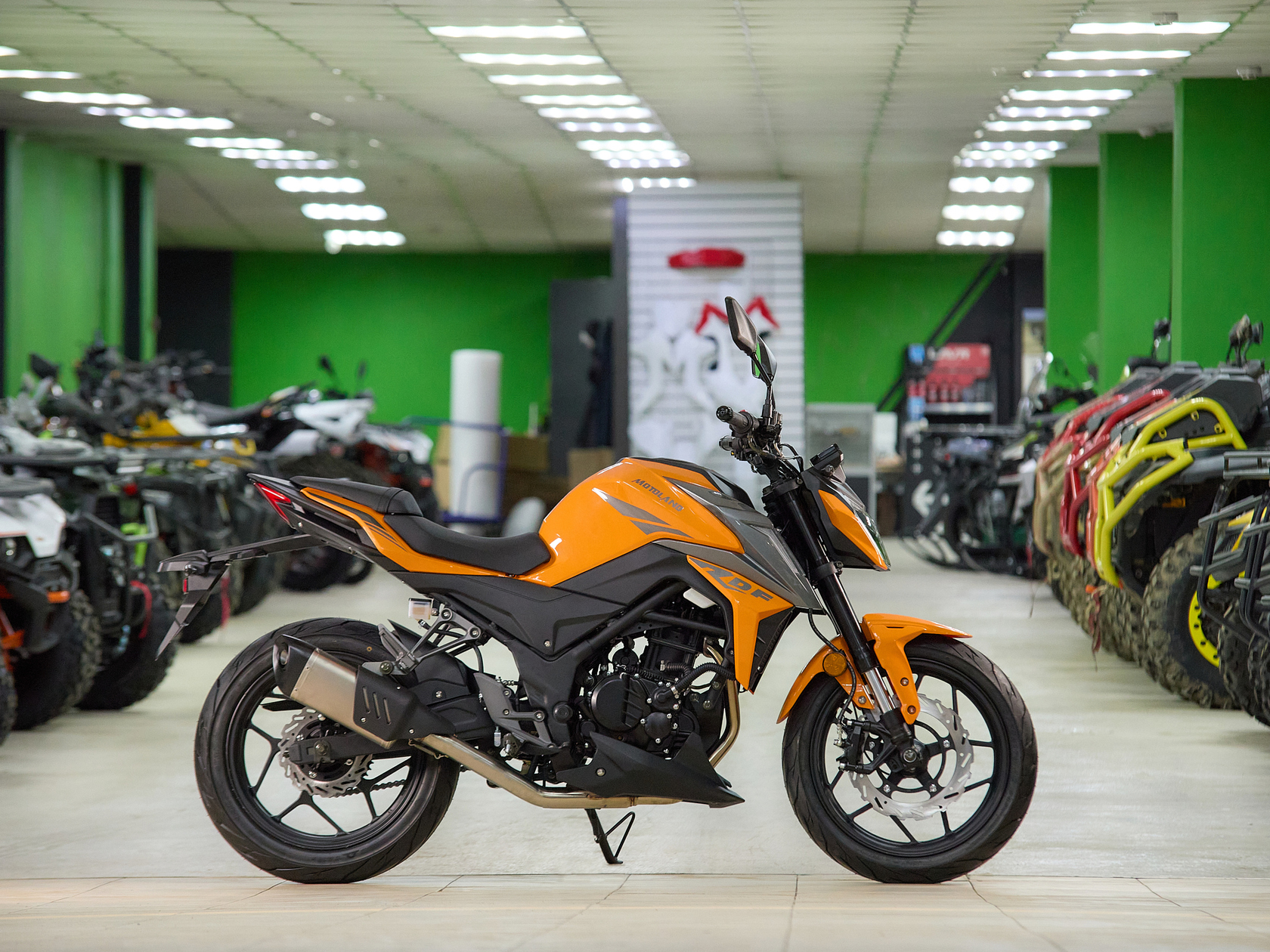 Новинка 2023 года MOTOLAND 250 DF BIG BORE !!!Представляем Вашему вниманию дорожный мотоцикл на шестискоростном двигателе 174 MN (CBS300 с балансиром) , с большим радиатором водяного охлаждения, с электростартером, мощностью 24 л.с. На двигателе установлен карбюратор Keihin PE 34 MV.Также на новинке передние и задние тормоза оснащены 4-х поршневыми суппортами, увеличен R переднего тормозного диска, литые алюминиевые обода , передняя вилка перевёрнутого типа с большим ходом, которая обеспечивает отличную управляемось для комфортного передвижения.Современный дизайн мотоцикла разработан с учетом всех последних новшеств.520Н усиленная сальниковая цепь в сочетании с хорошо подобранными звездами, обеспечивает отличную динамику.Хорошо подобранные покрышки на 17" ободах, 110/70 и140/70, обеспечивают отличное сцепление с дорожным покрытием.Рама скелетная. Удобное двухэтажное кожаное сиденье и обновленная жидкокристаллическая панель приборов с подсветкой - заставят радоваться комфорту и удобству.Передние и задние суппорта 4-х поршневые. Глушитель прямоточный Akrapovic с увеличенным диаметром трубы. Руль двойной усиленный переходного сечения.Передние удлиненные габаритные огни выполнены вертикально и встроены в пластик.Световое оборудование на экономичных и долговечных светодиодах. Топливный бак 12 л. Цвет оранжевый.