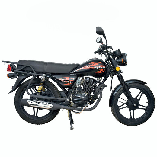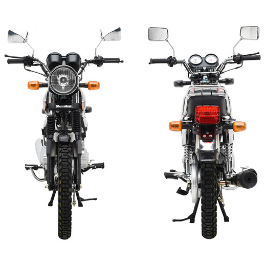 Комплектация Мотоцикл комплектуется всем необходимым оборудованием для комфортной и безопасной эксплуатации на городских и проселочных дорогах: приборная панель, зеркала, световое оборудование, электростартер (двигатель также можно завести при помощи кик-стартера), защитный кожух цепи, складные подножки пассажира и крепкий багажник. Тормоза барабанные.