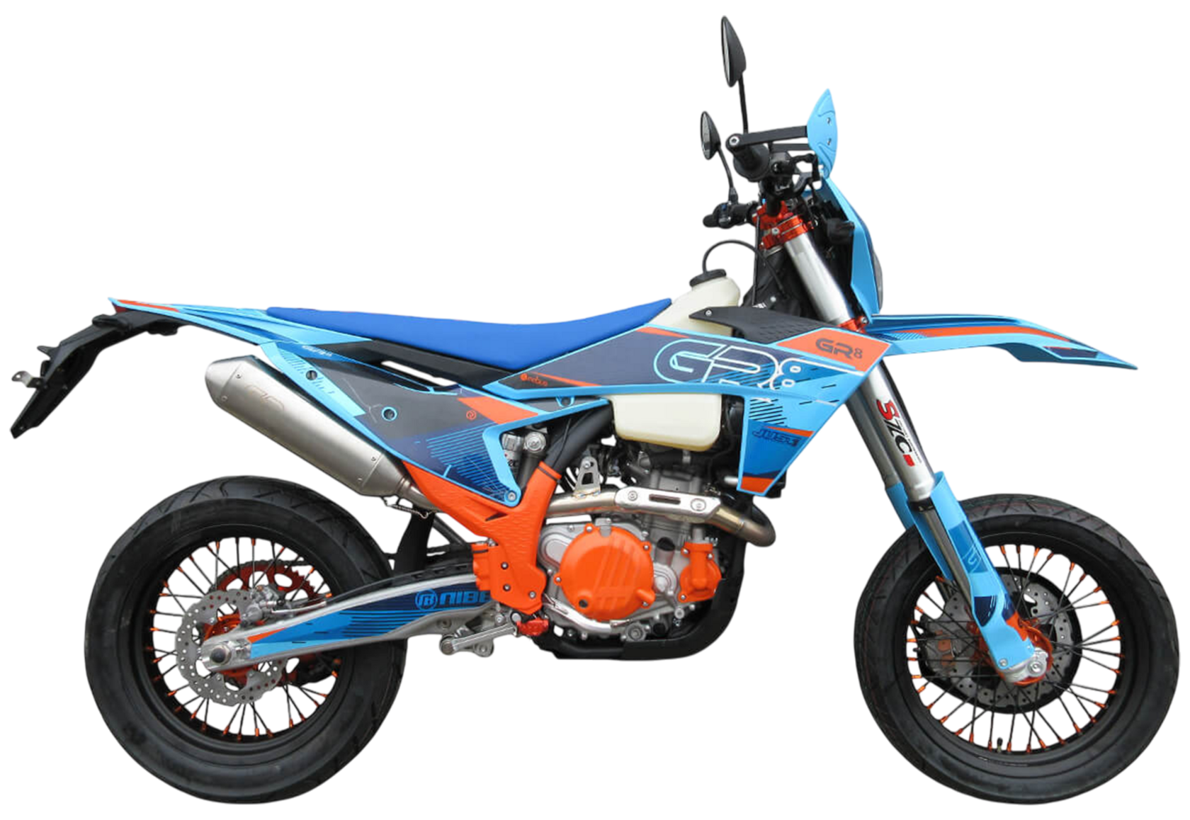 Мотоцикл-мотард GR8 F300L (4T NC300S EFI) Motard 2024 модельного года является городской версией модели GR8 F300L, адаптированной под езду по асфальту, имеющей шоссейную резину, полный набор светотехники и ПТС. Этот мотоцикл представляет собой оптимальный баланс производительности и технической оснащённости и создан для тех, кто не хочет расставаться с эндуро даже в городе. Идеальный снаряд как для гонок в классе супермото или стант-райдинга, так и для повседневной городской езды.Обновлённая модификация 2024 года вобрала весь опыт инженеров компании прошлых лет, а также самые последние наработки GR. Мотоцикл стал более производительным, комфортным и привлекательным.Одноцилиндровый 4-тактный двигатель жидкостного охлаждения с 4 клапанами и двумя распредвалами ZONGSHEN ZS182MN, также оснащённый балансирным валом, имеет объём 280 см³ и выдаёт 31 л.с., что позволяет развивать большую скорость и эффективно ускоряться после прохождения поворотов. Карбюратор DELPHI с диаметром диффузора 37 мм обеспечивает бесперебойную работу техники в самых жёстких условиях эксплуатации, простоту и лёгкость в обслуживании, а также неприхотливость к качеству топлива.Трансмиссия представлена 6-ступенчатой механической коробкой передач с классической схемой 1-N-2-3-4-5-6.Передняя подвеска – телескопическая вилка перевёрнутого типа SZC Optima длиной 940 мм, регулирующаяся на сжатие и отбой. Перья вилки снабжены защитными кожухами. Сзади установлен моноамортизатор с прогрессией SZC Optima длиной 480 мм, также регулируемый на сжатие и отбой. Рычаг прогрессии даёт преимущество, эффективно “отрабатывая” небольшие неровности.Мотоцикл оснащён классическими спицованными колёсами диаметром 17 дюймов, обутыми в шоссейную резину. Эффективное и безопасное замедление с любых скоростей обеспечивают гидравлические дисковые тормоза – спереди установлен 2-поршневой суппорт SZC и тормозной диск диаметром 260 мм, а сзади – однопоршневой суппорт SZC с диском диаметром 220 мм. Диск переднего тормоза снабжён специальным защитным кожухом.Модель 2024 года собрана на новой раме, обладает ярким пластиком с обновлённым дизайном, имеет вес 119 кг. Топливный бак вмещает 11 литров горючего.Мотоцикл укомплектован защитой кистей с пластиковыми “лопухами”, а также яркой фарой, которая позволяет кататься в тёмное время суток.Благодаря наличию ПТС и необходимого светового оборудования мотоцикл можно поставить на учёт, чтобы ездить по дорогам общего пользования.GR8 F300L (4T NC300S EFI) Motard сочетает отличные технические характеристики, комфорт и надёжность, что позволяет ощутить свободу на любой трассе.