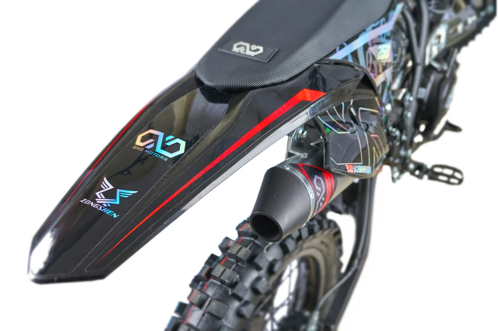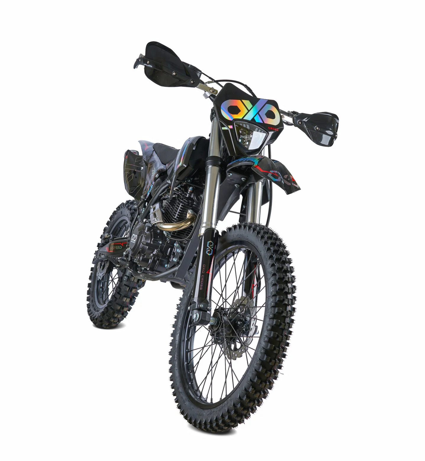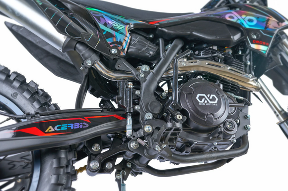 ДвигательМодель оснащена двигателем Zongshen 172FMM-3A с пятиступенчатой КПП. Особенностью двигателя, можно считать то, что данный двигатель является самым надежным среди серии моторов Zongshen.РамаРама мотоцикла OXO производится из труб шестигранного сечения хром-молибденовой стали, которая является очень прочной и легкой. Геометрия рамы, благодаря правильно выверенному центру тяжести и углу наклона вилки - способствует наилучшей управляемости устойчивости мотоцикла на низкой скорости.ПодвескаПередняя вилка перевернутого типа. Мотоцикл снабжен моноамортизатором, который соединен посредством системы рычагов прогрессии. Система прогрессии, обеспечивает равномерную, мягкую работу и увеличивает длину рабочего хода подвески.КолесаВ переднем и заднем колесах установлены антибуксаторы, которые притягивают покрышку к ободу, позволяя ездить по бездорожью при низком давлении в камерах, не давая покрышке проворачиваться во время езды. Размер передней покрышки: 80/100-21. Размер задней покрышки: 120/100-18. Они прекрасно себя ведут по песку и грязи, что позволяет райдеру отлично показать себя на пересеченной местности.Тормозная системаТормозная система мотоцикла - полностью гидравлическая с армированными шлангами. Спереди и сзади установлен двухпоршневой суппорт. Данная конфигурация тормозных механизмов, позволит быстро и безопасно остановиться с максимальной скорости даже на бездорожье.РульВажная часть современного эндуро мотоцикла - усиленный руль переменного сечения. На руле установлен рычаг заслонки подсоса. Алюминиевая ручка газа с коротким ходом имеет регулировку троса..