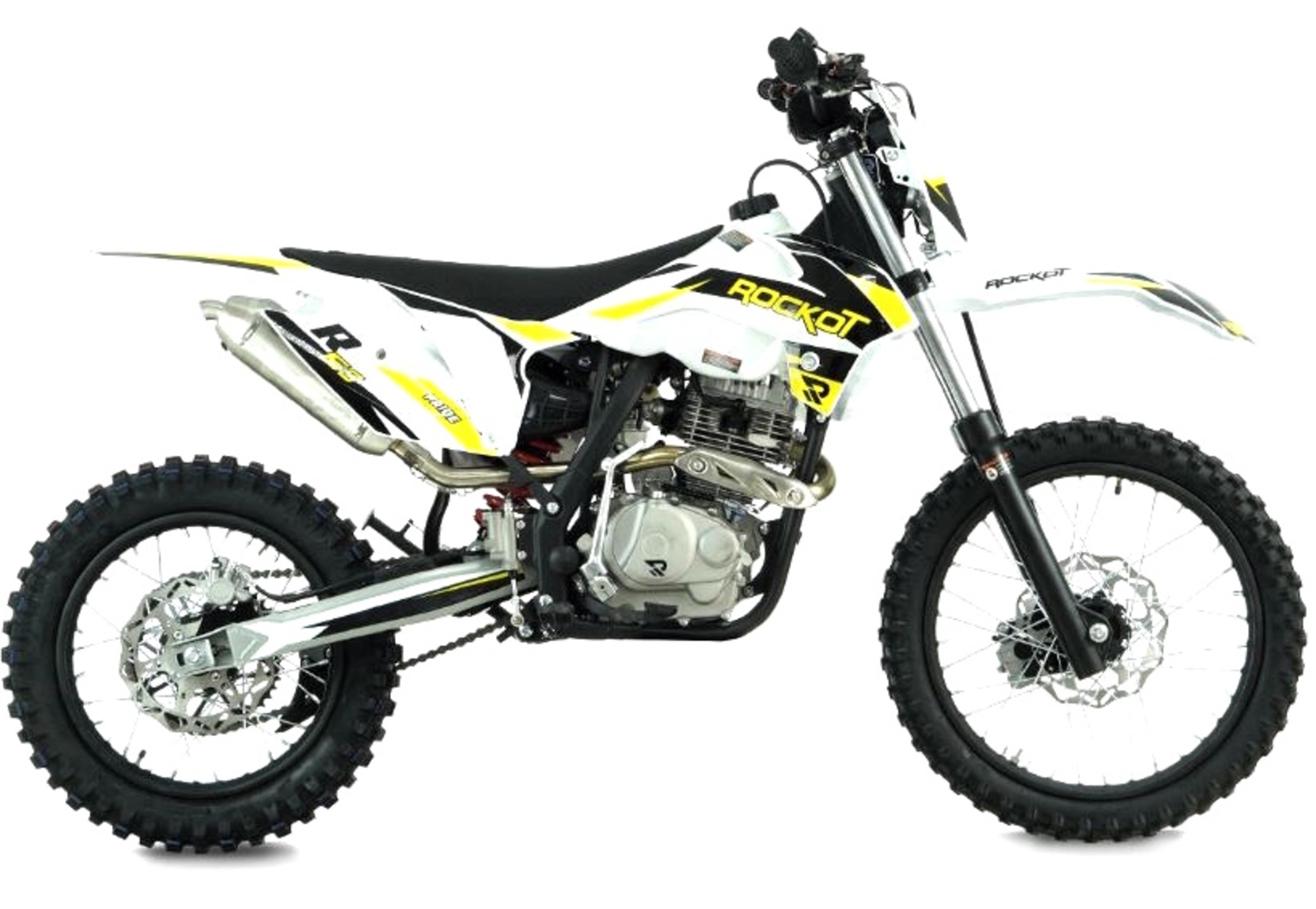 1ROCKOT R5S - эндуро мотоцикл начального уровня, который создан для новичков и подростков. Небольшая высота по седлу и короткая колесная база обеспечивают отличную управляемость и позволяют управлять мотоциклом людям, чей рост достигает 150 см. ROCKOT R5S построен на базе уже известных многим мотоциклов ROCKOT R5 Cyclone и R5F Raptor. ДизайнМотоциклы ROCKOT серии R имеют общую раму, пластик и концепцию дизайна. Различна между ними цветовая схема графики облицовочного пластика.Рама мотоцикла R5S окрашена в черный цвет. На белом облицовочном пластике нанесена прочная защитная пленка с графикой в белом черном и желтом цветах. Сам пластик выполнен в стиле КТМ 2015. Передние амортизаторы и обода колесных дисков, как и рама, окрашены в черный матовый цвет. ДвигательЭндуро мотоцикл ROCKOT R5S оснащен четырехтактным двигателем, объемом 144,6 см³ и мощностью 11,6 лошадиных сил. Система ГРМ 2-х клапанная с верхним распредвалом. Запуск двигателя может осуществляться как электростартером, так и кик-стартером. Коробка передач - пятиступенчатая с многодисковым сцеплением в масляной ванне. Двигатель очень отзывчиво откликается на ручку газа, но в то же время прощает ошибки, поэтому данная модель и будет идеальной для новичка. РамаROCKOT R5S построен на раме типа К5, ставшей очень известной благодаря мотоциклам ROCKOT R5 Cyclone и R5F Raptor. При том, что это мотоцикл с высотой по седлу равной питбайку, он имеет настоящую полноценную мотоциклетную раму из хром-молибденовой стали. Геометрия рамы идеально сбалансирована для эндуро и обеспечивает отличную управляемость на бездорожье. Подрамник также выполнен из стали. ПодвескаДанная модель построена на классической эндуро подвеске. Спереди установлена телескопическая вилка с толщиной перьев 37 мм, что является внушительным диаметром для классической вилки. Сзади установлен стальной маятник с моноамортизатором. Конструкция задней подвески - безлинковая, что упрощает обслуживание мотоцикла. Тормозная системаПолностью вся тормозная система мотоцикла - дисковая гидравлическая. Спереди и сзади установлены тормозные диски равного диаметра - 240 мм. Сзади установлен однопоршневой тормозной суппорт, спереди - двухпоршневой. КолесаВажная отличительная часть мотоцикла - колеса размерностью 19/16. Данное решение позволило сделать среднеразмерный эндуро мотоцикл идентичным по геометрии и управляемости полноразмерному эндуро, а также уменьшить высоту по седлу. Спереди установлена шина размерностью 80/100-19, сзади - 110/90-16 с внедорожным грязевым протектором.. Также, в отличие от других мотоциклов подобной компоновки, он приводится в движение цепью с 520 шагом, тогда как у других мотоциклов установлена цепь с шагом 428. Стальная приводная ведомая звезда на 47 зубьев обеспечивает высокий крутящий момент и позволяет заезжать на высокие подъемы с крутым уклоном. Кому подойдет эндуро мотоцикл ROCKOT R5SROCKOT R5S можно назвать промежуточной моделью между питбайком и полноценным мотоциклом. Колесная база мотоцикла - 1340 мм, а высота по седлу - 850 мм. Если вы задумываетесь, что вам подойдет больше, питбайк или мотоцикл - ROCKOT R5S для вас. Данная модель поможет райдеру понять принцип управления мотоциклом, научиться пользоваться мотоциклетной пятиступенчатой коробкой передач и почувствовать отличную управляемость, которая присуща только мотоциклам. Данную модель высоко оценя