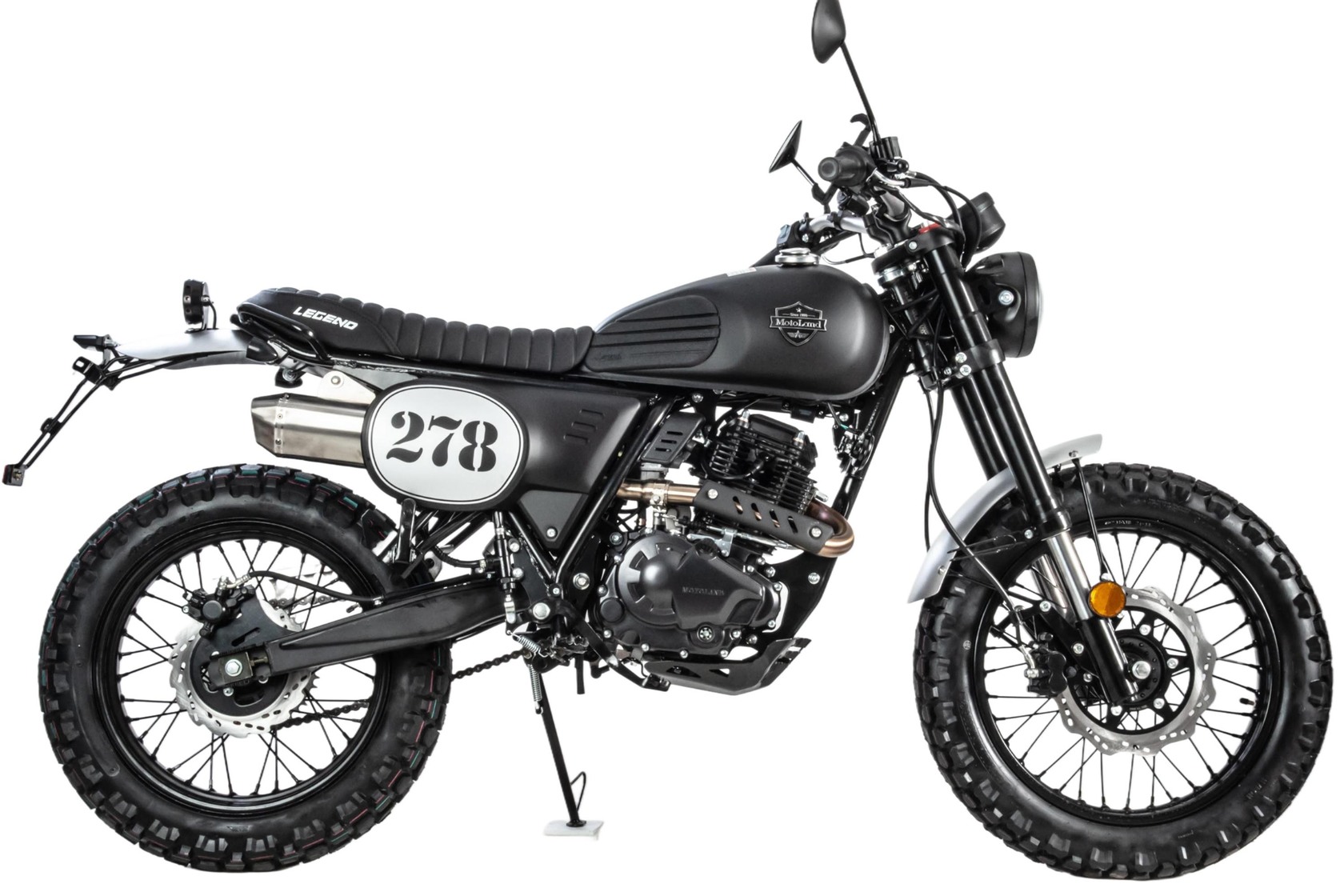 LEGEND 300 – является стильным мотоциклом с достойными характеристиками в бюджетной категории. Дизайн мотоцикла выполнен в гоночном ретро стиле, укомплектованный современной LED оптикой, приборной панелью, титановым выхлопом, креплением номерного знака и прочими канонами современности.Низовой покладистый мотор, классическая посадка, мягкое рифлёное сидение и спицованные колеса – всё это способствует комфортному управлению по асфальтированным дорогам и пересеченной местности.LEGEND 300 был спроектирован как универсальный мотоцикл, для райдеров любых возрастов. На нём будет комфортно в городе, посёлке, деревне, поле и даже в лесу.Мотоцикл оснащен двигателем 175FMM-5 (баланс. вал) с 6 ступенчатой коробкой передач, мощностью 25 л.с. Впуск оснащен карбюратором Keihin PZ30, выпуск – титановым выхлопом от Motoland.Установлена металлическая защита картера, алюминиевые крылья и защита цепи, усиленный толстостенный руль и усиленная 520 цепь.