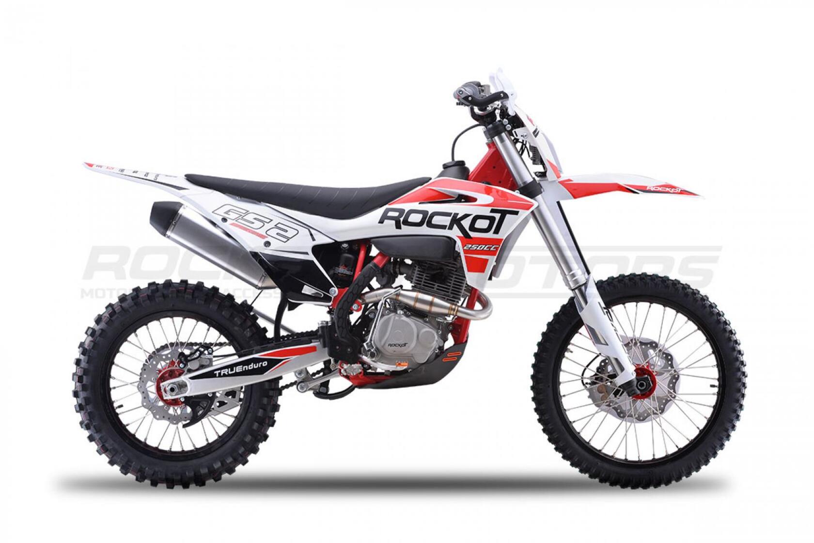 Вторая, обновленная версия эндуро мотоцикла ROCKOT GS 2 Origine.GS 2 Origine - полноразмерный эндуро мотоцикл, удовлетворяющий вкусу и потребностям как новичков, так и опытных райдеров.Мотоциклы ROCKOT серии GS, обрели высокую популярность, благодаря применению в плане дизайнерского и практического решения - пластика модели GASGAS.На белый пластик, нанесена графика в белой, красной, черной расцветке. Выбранное цветовое решение, придает мотоциклу броский, стильный дизайн, так характерный для внедорожной техники. Каждая деталь мотоцикла, дополняет общую концепцию дизайна.Обода колесных дисков окрашены в черный цвет, а красная графика нанесенная в виде наклеек, защитит ЛКП ободов от царапин. Алюминиевые ступицы окрашены в яркий, красный цвет.На черной раме установлена защита красно-черного цвета. Также, в красном цвете представлены: CNC крышка топливного бака и обслуживаемый топливный фильтр. Защита рук, складные, алюминиевые рычаги и траверсы окрашены в черный цвет.Предыдущая версия эндуро мотоцикла ROCKOT GS 2 Origine оснащалась двигателем CB250-F 172FMM-3A. Обновленный GS 2, обрел новый двигатель PR250 172FMM-5, с балансирным валом и пятиступенчатой КПП.Балансирный вал, значительно снижает уровень вибрации от двигателя, что ранее было единственным минусом двигателя CB250-F. Особенностью двигателя, можно считать то, что мощность двигателя осталась прежней - 21 лошадиная сила.За образование топливной смеси и ее подачу в двигатель, отвечает производительный карбюратор PE30. Повышает характеристики мощности и крутящего момента - обновленный “PowerBomb” увеличенного объема. Коробка передач - пятиступенчатая, с многодисковым сцеплением.ROCKOT GS 2 Origine построен на новой раме S8, которая является улучшенной, доработанной версией популярной рамы K8, аналогичной по геометрии рамам “австрийской троицы”. Рама производится из труб шестигранного сечения хром-молибденовой стали, которая является очень прочной и легкой. Подрамник производится из алюминия. Геометрия рамы, благодаря правильно выверенному центру тяжести и углу наклона вилки - способствует наилучшей управляемости устойчивости мотоцикла на низкой скорости.Устанавливаемая на мотоцикл ROCKOT GS 2 Origine подвеска известной фирмы “KKE” - делает мотоцикл одним из наиболее подходящих для проезда по сложным эндуро маршрутам. Спереди расположена телескопическая вилка перевернутого типа, длиной - 940 мм и толщиной рабочего штока - 48 мм. Конструкция вилки - регулируемая с картриджем открытого типа. Данная конструкция подвески отлично проявляет себя в эндуро, в том числе и в режиме гонки.Сзади установлен усиленный маятник из алюминия, который соединен с задним моноамортизатором, посредством системы рычагов прогрессии. Моноамортизатор “KKE” длиной 470 мм, регулируется на скорость сжатия, скорость отбоя и преднатяжение пружины. Широкий диапазон регулировки передней и задней подвески, позволит точно настроить ее работу под вес и стиль езды каждого райдера. Система прогрессии, обеспечивает равномерную, мягкую работу и увеличивает длину рабочего хода подвески.