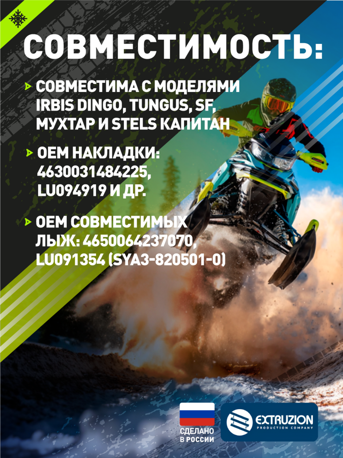 Улучшенная проходимость и управляемость. Повышение плавучести снегохода на рыхлом снегу за счет увеличенной площади контакта Улучшенная курсовая устойчивость и контроль на скорости Эффективное преодоление сложных участков бездорожья