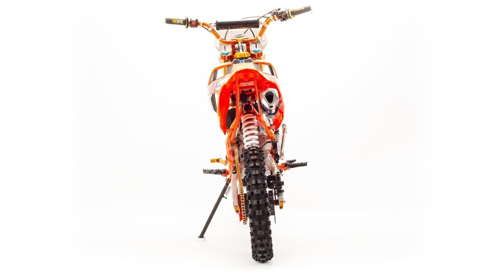 Комплектация Стальной маятник. Защита двигателя. Стальной руль 22мм. Пластиковая крышка бака. Прямоточный выхлоп. Складывающася лапка КПП. Цепь : KMC 420. Тормозная система гидравлическая, тормоза дисковые.
