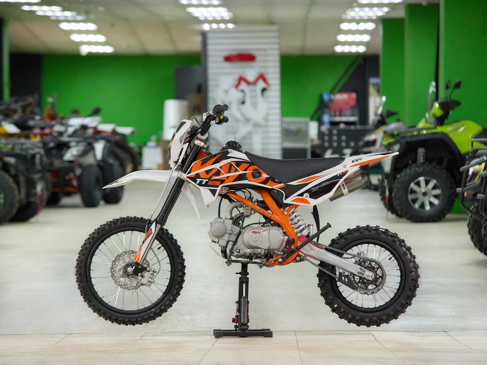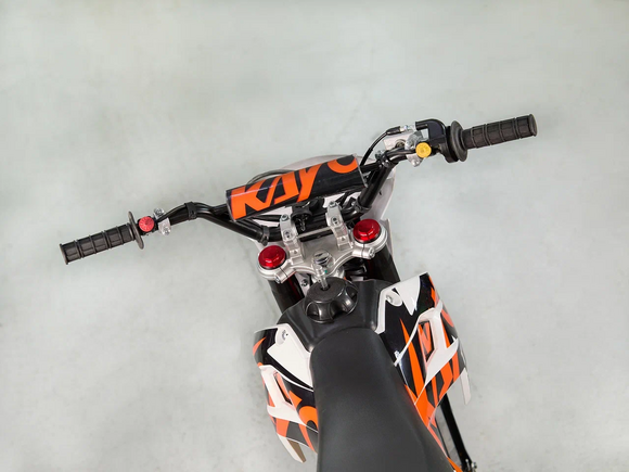 Питбайк KAYO Basic K125EM KRZ – идеальный снаряд для наработки первого опыта в мотокроссе и эндуро, который можно использовать на лёгких кроссовых трассах и дорогах с различным покрытием. Удобный, простой и надёжный мотоцикл, который полностью оправдывает свою цену.Одноцилиндровый 4-тактный двигатель воздушного охлаждения объёмом 125 см3, выдаёт 9 л.с. Карбюратор NIBBI PE19 обеспечивает бесперебойную работу техники в самых жёстких условиях эксплуатации, простоту и лёгкость в обслуживании, а также неприхотливость к качеству топлива. Питбайк оснащён механической 4-ступенчатой коробкой передач с формулой “N-1-2-3-4”.Мотоцикл имеет вес всего 72 кг. Усиленная рама из хром-молибденового сплава и подвеска позволяют эффективно амортизировать удары при езде по неровностям и препятствиям на трассе. Передняя подвеска — телескопическая вилка перевёрнутого типа длиной 770 мм, задняя — моноамортизатор длиной 360 мм. Оба компонента подвески являются нерегулируемыми. Рама и пластик являются собственной разработкой производителя. Мотоцикл оснащён классическими стальными спицованными колёсами диаметром 17 дюймов спереди и 14 дюймов сзади. Эффективное и безопасное замедление с любых скоростей обеспечивают гидравлические дисковые тормоза.Высококачественная износостойкая резина с развитым протектором отлично держит дорогу на различных типах покрытия. Байк оснащён как системой запуска двигателя при помощи кнопки электростартера, так и рычагом кик-стартера. Питбайк имеет вместительный топливный бак на 5,5 л, что гораздо больше, нежели у других байков этого класса.Питбайк оснащён стальной защитой картера и яркой светодиодной линзованной фарой.Если вы ищете послушный, компактный, шустрый и красивый питбайк, считайте, что вы его нашли. Это один из лучших мотоциклов для обучения и первых шагов в эндуро и мотокроссе. Он отлично подойдёт как для гонок на трассе, так и для покатушек по пересечённой местности.