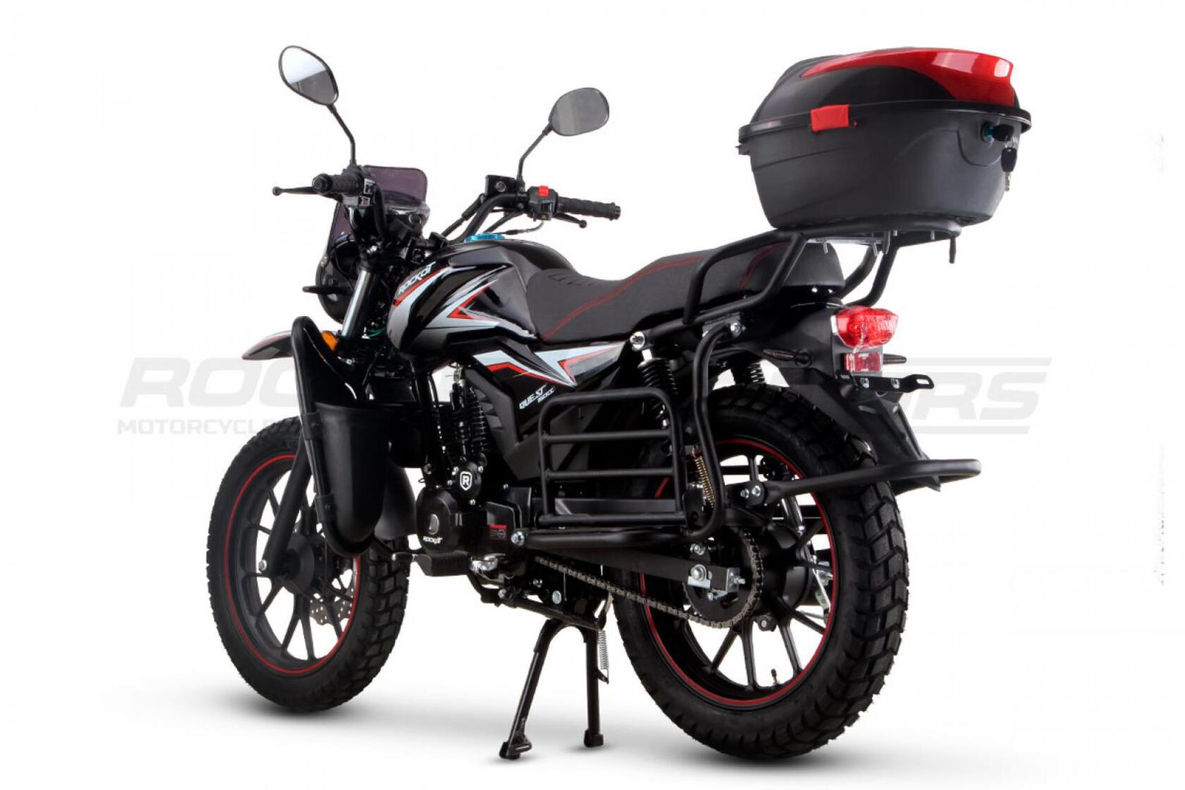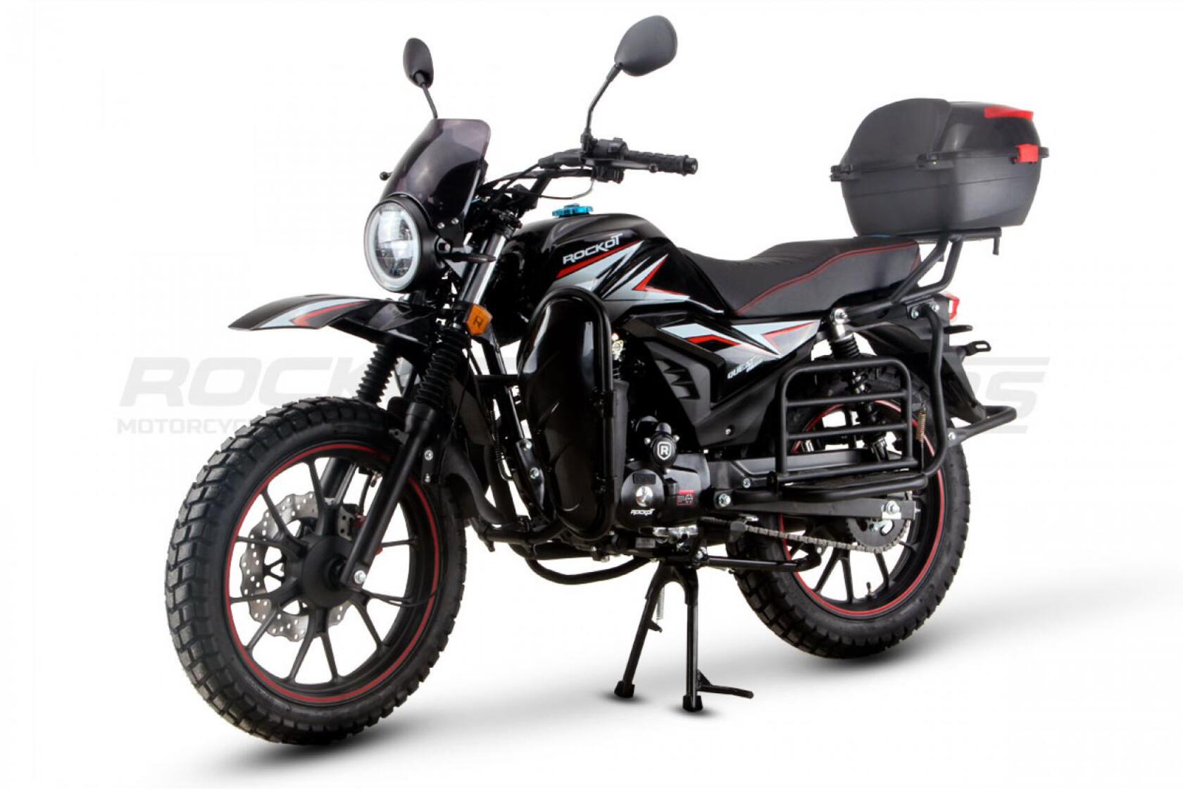 ROCKOT QUEST 150 - новый, дорожный мотоцикл от компании ROCKOT-MOTORS, с большим потенциалом на длительные поездки, независимо от типа дорожного покрытия. Благодаря своим компактным размерам, короткой колесной базе, мотоцикл отлично чувствует себя в городской среде с большим объемом дорожного трафика. Максимальная скорость ROCKOT QUEST 150 - до 92 км/ч на стандартных приводных звездах. Масса мотоцикла -126 килограмм, но при небольшой высоте по седлу в 820 мм и низкому центру тяжести, он ощущается достаточно легким.Мотоцикл имеет ЭПТС, оснащен цветной электронной панелью приборов, зеркалами, всей необходимой светотехникой, что позволяет законно передвигаться по дорогам общего пользования. ДизайнМотоцикл построен в классическом исполнении, но имеет множество современных, технологичных решений.Все световые приборы - светодиодные и очень яркие. Передняя фара имеет круглую классическую форму, но стоит ее включить, как мотоцикл обретает совершенно другой вид.Цветовая гамма модели имеет три варианта окраски: бело-красный, черный и серый.Конечно же, бросается в глаза оснащение мотоцикла туристической багажной системой. На заднем багажнике установлен жесткий центральный кофр. Откидные боковые багажники, позволяют перевозить объемный груз, а также устанавливать боковые багажные сумки. Глядя на мотоцикл, складывается впечатление, что все его пространство использовано максимально практично. Даже в дугах безопасности встроены дополнительные багажные карманы.Топливная системаВ основе топливной системы ROCKOT QUEST 150 - большой топливный бак объемом 12 литров. В зависимости от условий эксплуатации и стиля езды, расход топлива варьируется в районе 3-3,5 литров на 100 километров. Это позволяет преодолевать большие расстояния на одном баке бензина. Используемый тип топлива - бензин АИ-92. Образует топливную смесь - карбюратор PZ27 с ускорительным насосом. Ускорительный насос исключает момент “провала” при резком открытии дроссельной заслонки.Тормозная системаПо канонам классического мотоциклостроения, ROCKOT QUEST 150 имеет комбинированную тормозную систему. Спереди установлен дисковый гидравлический тормоз, с двухпоршневым суппортом, яркого красного цвета. Задний тормоз - механический, барабанный.Кому подойдет ROCKOT QUEST 150Мотоцикл будет очень полезен новичкам. Его небольшие габаритные размеры, низкий центр тяжести, малая высота по седлу - позволяют быстро освоить технику управления мотоциклом как в условиях города, так и бездорожья. С практичной точки зрения, мотоцикл понравится любителям выезжать на отдых за город. Отличная туристическая подготовка, позволит перевозить все, что Вам может потребоваться во время отдыха.Благодаря заложенной надежности в конструкцию двигателя и мотоцикла - ROCKOT QUEST 150 оценит старшее поколение, для кого требуется простая и надежная техника.
